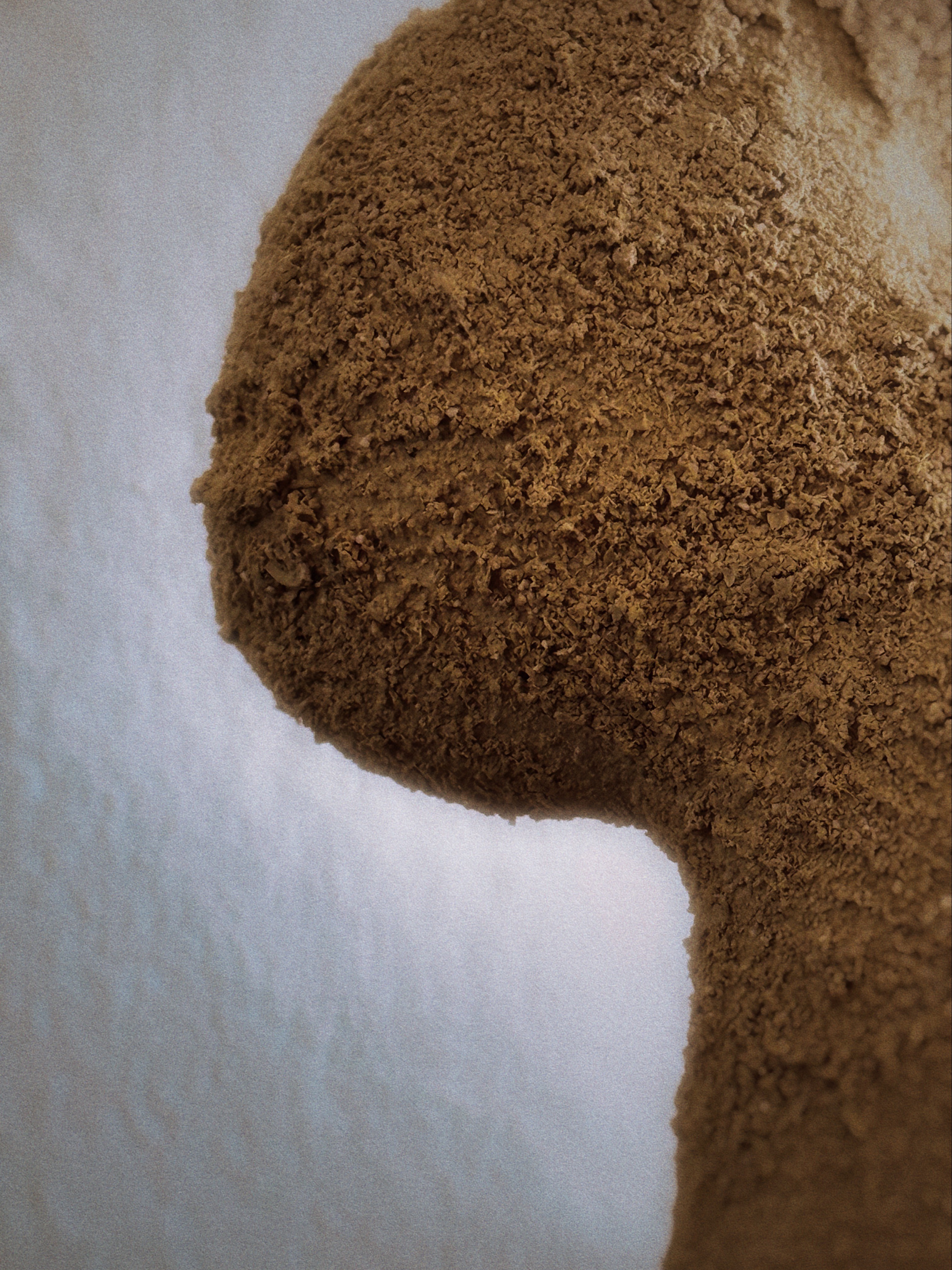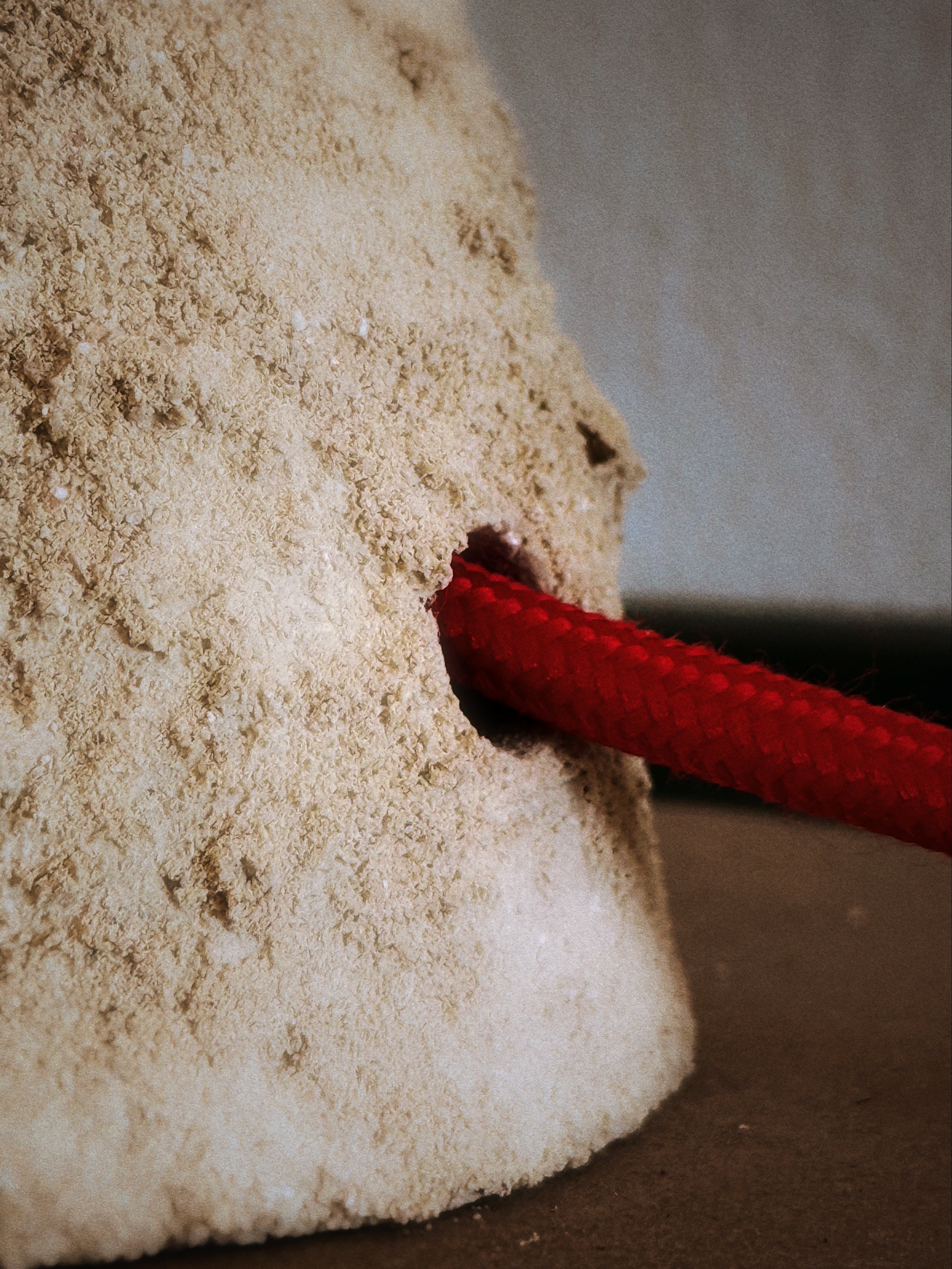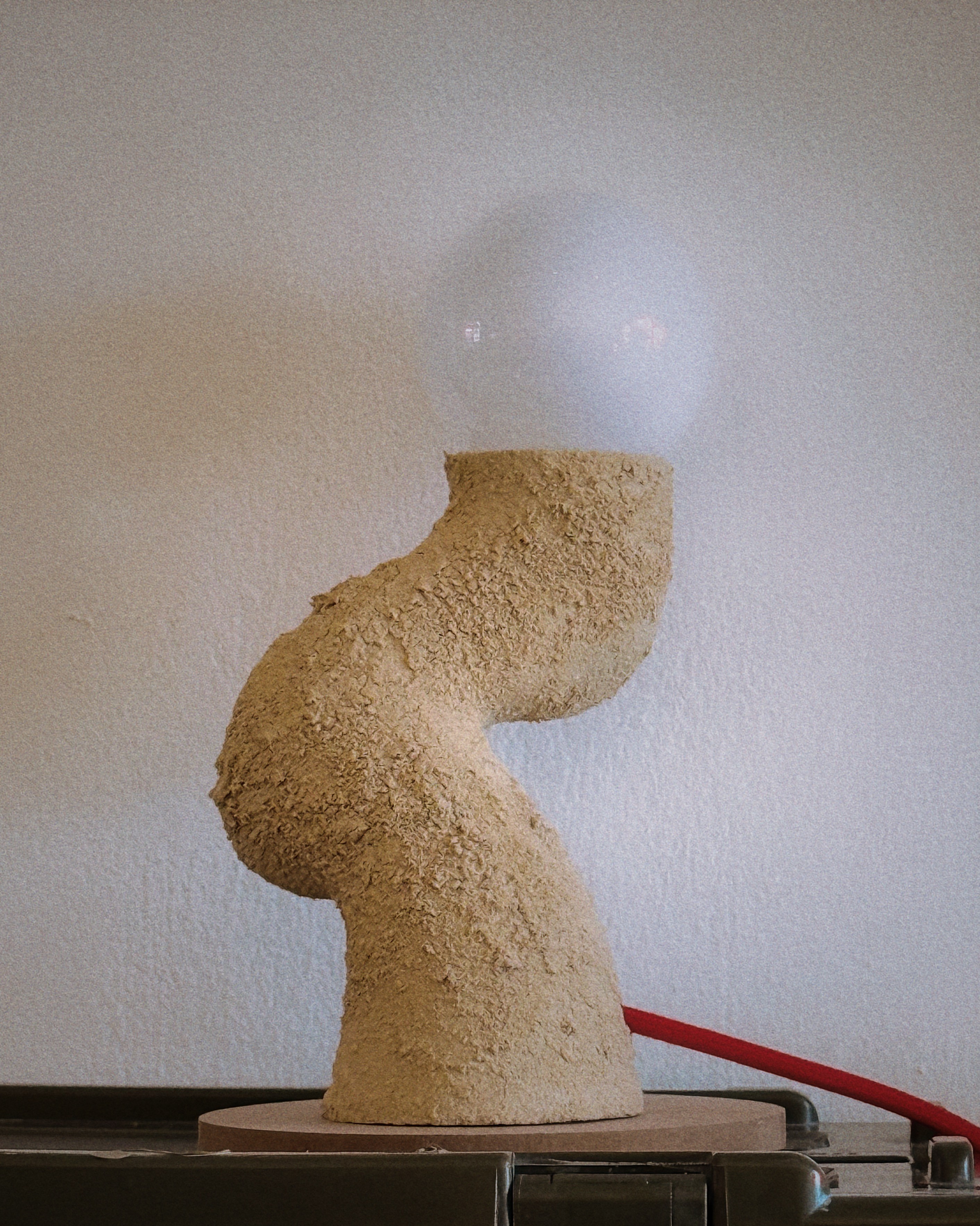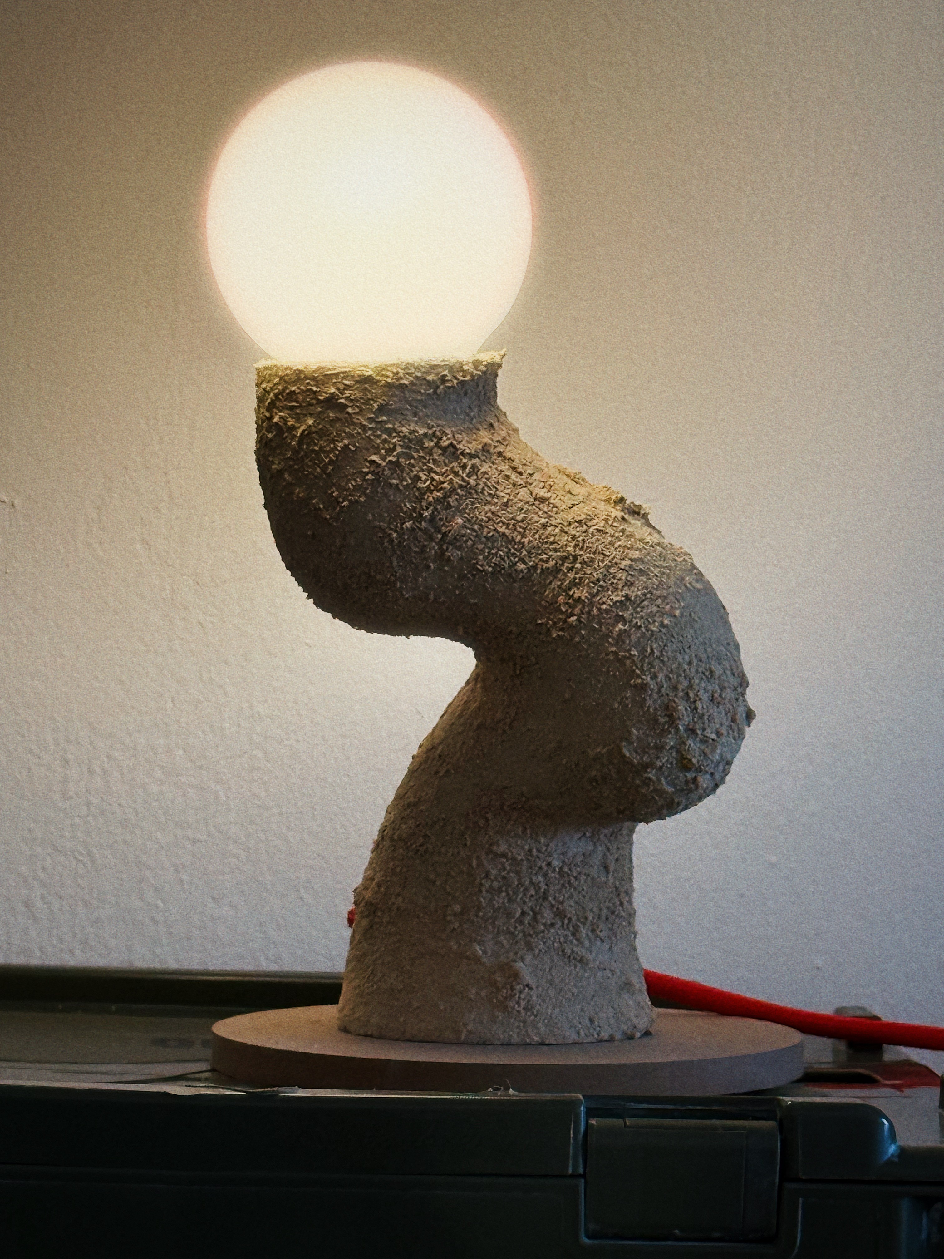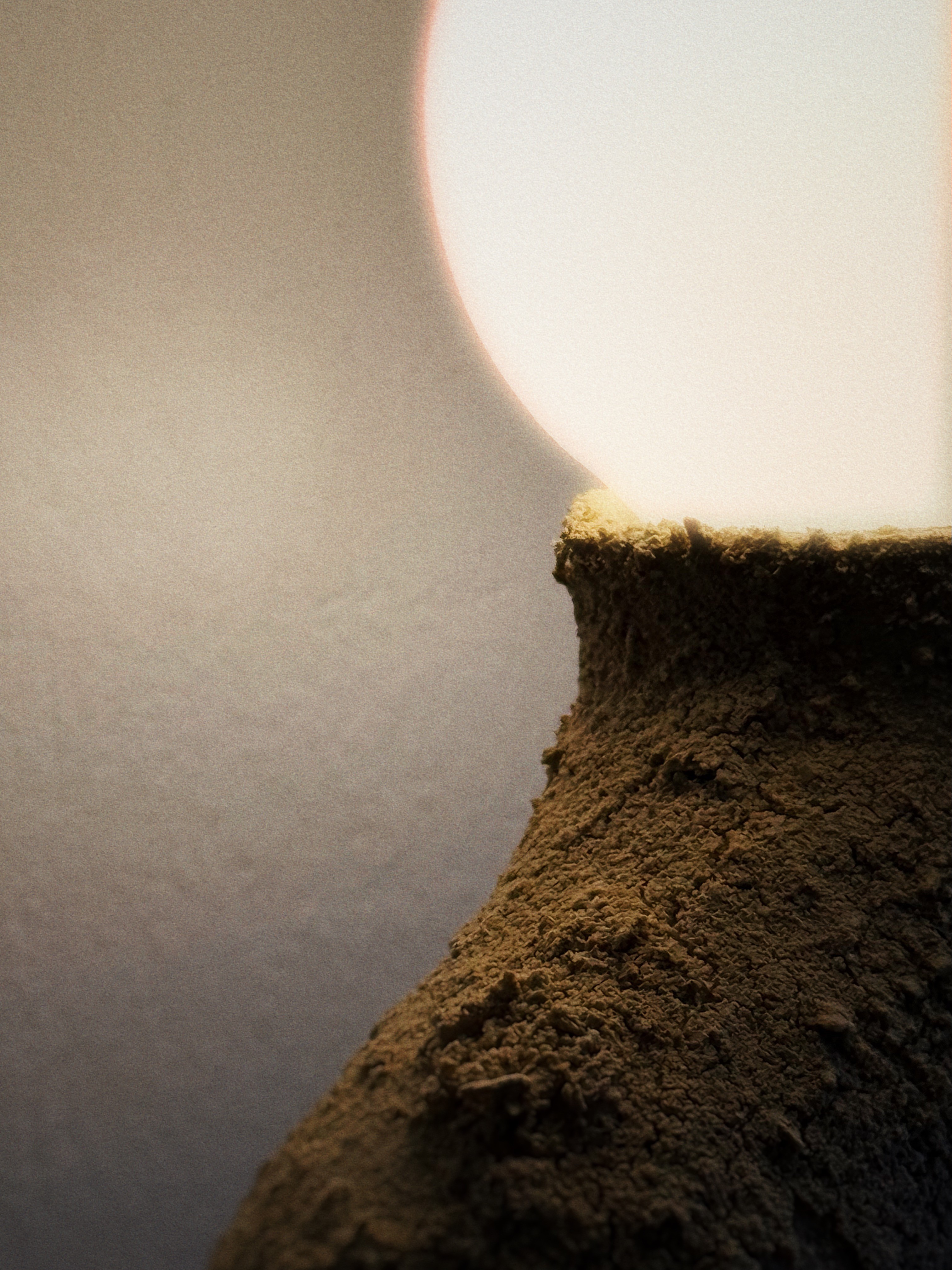 This piece leans in an unexpected curve, like a spine caught mid-turn. Built with raku clay remnants, its surface holds a raw, tactile texture, an earthy contrast to the smooth glow above.